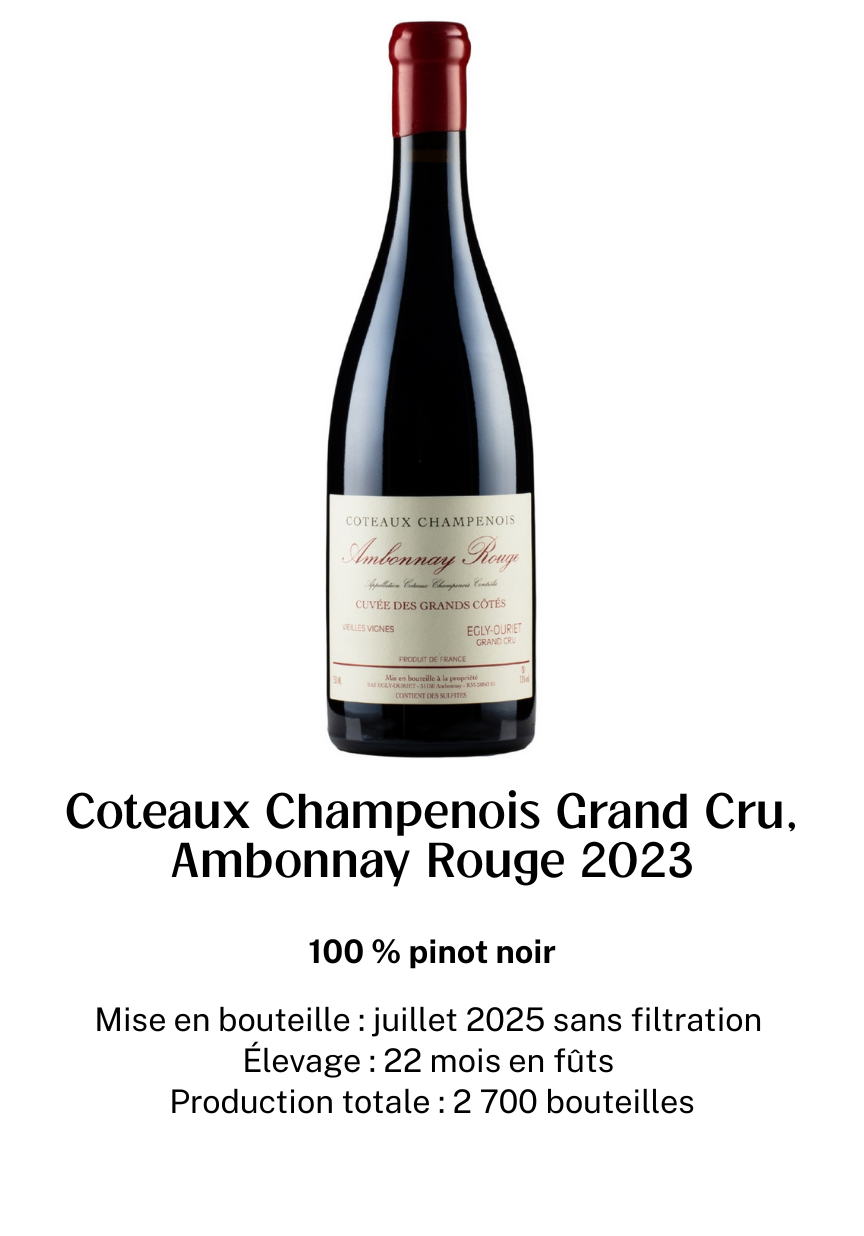 Outre ses champagnes emblématiques, Egly-Ouriet signe également quelques rares Coteaux Champenois rouges issus de pinot noir. Produits en très petites quantités, ces vins tranquilles figurent parmi les plus recherchés de l’appellation, admirés pour leur stature bourguignonne et leur profondeur remarquable.